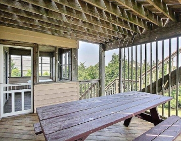 Parking for two vehicles under house; extra parking for two more vehicles. A landline phone is available for local calls and emergencies. On the main level deck is a full-sized picnic table, which is under a covered section of the upper deck. There is also a screened-in area adjacent. The upper deck is spacious and affords great views.